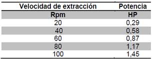 La potencia requerida para una capacidad de extracción de 4 kg/h, y con una variación de la velocidad de trabajo viene descrita en la Tabla 6.