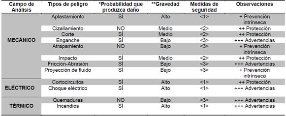 Para realizar un análisis de seguridad en un diseño de máquina, un estudio de peligrosidad o bien la elaboración de normas e instrucciones de uso, se han de tener presentes todos y cada uno de los peligros susceptibles de ser generados por las máquinas basados en la Norma NTP 235: Medidas de seguridad en máquinas: criterios de selección para análisis de peligro en el campo mecánico, eléctrico y térmico (INSHT, 1989).