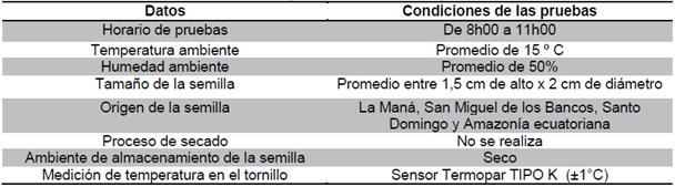 Las pruebas de funcionamiento del prototipo se realizaron en la ciudad de Quito en condiciones ambientales promedio de temperatura 15°C y humedad relativa del 50%. Se utilizaron muestras de 20 Kg de semillas de diferente procedencia a velocidades de 20 y 80 rpm. En la Tabla 9 se pueden observar los parámetros más relevantes para la ejecución de los ensayos.