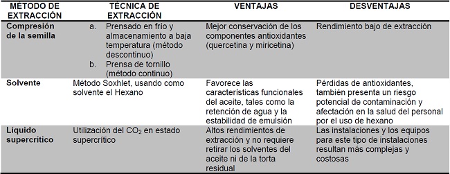 Existen diferentes métodos de extracción de aceite a partir de estas semillas, el uso de estos provocan, variaciones en el rendimiento de aceite, calidad y contenido de ácidos grasos, fibras dietéticas totales y también contenido de antioxidantes. Entre los métodos más conocidos se puede mencionar: (Ali N, 2012)