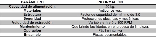 De acuerdo con el estudio realizado sobre los diferentes métodos de extracción, se concluye que el sistema más adecuado para la realización de este trabajo es la implementación del prototipo con un mecanismo de tornillo extrusor. Se requiere entonces, dimensionar el dispositivo en función de la fuerza necesaria para la ruptura de la semilla.