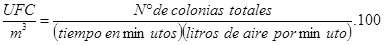 Cuantificación, la toma de muestra se realizó por filtración con bomba de vacío, capacidad de filtración de aire 85L/min, utilizando una membrana Microclar de Acetato de celulosa de 0,22 um; las membranas fueron colocadas en cajas Petri con Agar Sabouraud-cloranfenicol. Temperatura y tiempo de incubación: 25oC por 7 días. La concentración de hongos en el aire se expresó en unidades formadores de colonia por metro cúbico de aire (UFC/m3) y se calculó usando la Fórmula 2:
