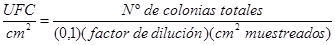 Se realizó una dilución 10-1, sembró 0,1 ml por extensión en agar Sabouraud-cloranfenicol, se incubó a 25oC por 7 días y se calculó el número de UFC/cm2, utilizando la Fórmula 3.