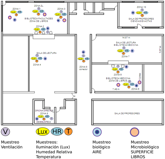a) Muestra de aire: las bibliotecas fueron zonificadas en área de libros (dividida en zonas según su tamaño), salas de lectura, puestos de trabajo, oficinas de control y corredores aledaños, en la Figura 1 se puede observar, como ejemplo, la zonificación de las bibliotecas Facultades y Medicina para el muestreo.