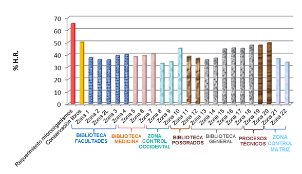 La Biblioteca General que se encuentra en el edificio antiguo es la que tiene el mayor valor de humedad relativa y asociado a la acumulación de polvo que presenta tiene el % de riesgo más alto, es importante mencionar que los mínimos corresponden a la zona de libros y los máximos a la zona salas de lectura.