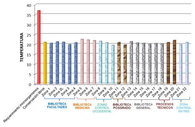 Humedad Relativa y Temperatura (figuras3y4), están por debajo de los valores que Totora, et al (2007) indica como idóneos para el crecimiento de microorganismos (HR 65 - 70 % y Temperatura 25 - 40°C). Las condiciones existentes ayudan a controlar la proliferación de hongos y son favorables para la conservación de bienes documentales con soporte en papel, Caneva et al (1991) y Borrell et al (2004) recomiendan valores entre 45% y 55% de Humedad Relativa y temperaturas entre 16°C y 21°C.
