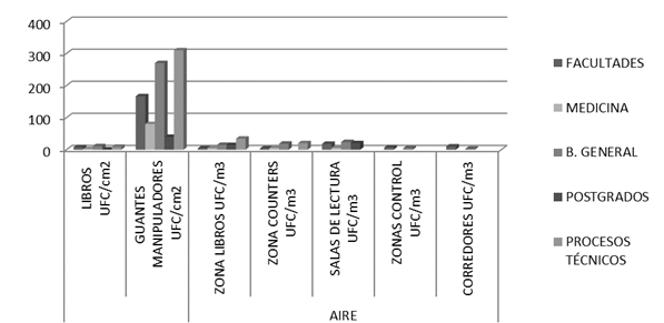Existe transferencia de los microorganismos entre libros, aire y trabajadores, el nivel de riesgo es medio en la Biblioteca General y en la oficina de Procesos Técnicos, bajo en las Bibliotecas de: Medicina, Posgrados y Facultades.