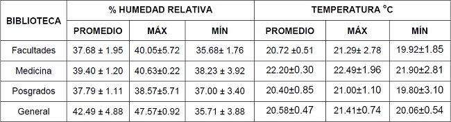 La evaluación de las Condiciones Termo-Higrométricas e Iluminación arrojó los siguientes resultados: El registro de ventilación fue cero en todas las bibliotecas evaluadas, lo cual facilita el depósito y acumulación de polvo conjuntamente con microorganismos y esporas. La Humedad Relativa y temperatura promedio así como los máximos y mínimos en cada biblioteca se pueden observar en la Tabla 2.