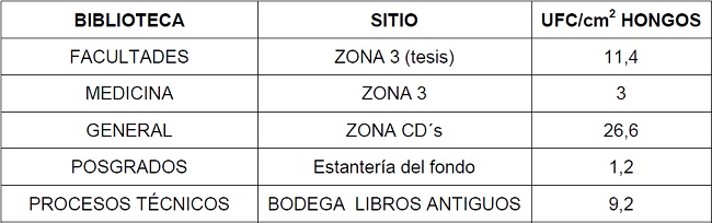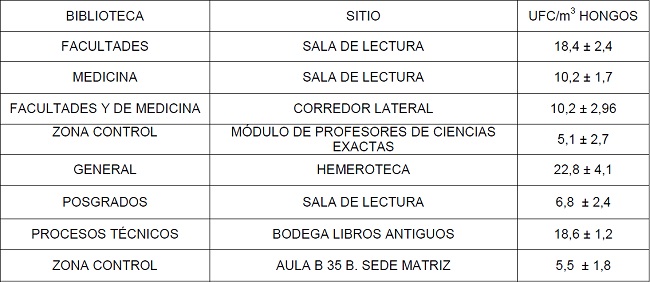 En cuanto a la distribución de la carga biológica total de hongos en el aire, se encontraron diferencias entre las zonas dentro de cada biblioteca, evidenciándose el nivel más alto en los sitios en que el número de personas presentes es mayor, como en las salas de lectura, la sala de profesores y el aula, estas dos últimas tomadas como zonas de control, con excepción de la Biblioteca General y de Procesos Técnicos, en las cuales la mayor concentración fue en la Hemeroteca y en la reserva de libros antiguos respectivamente, como se puede ver en la Tabla 3.