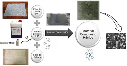 Resumen: Los estudios de los materiales compuestos juegan un papel importante en aplicaciones de ingeniería, materiales, metalurgia y mecánica. Las fibras reforzadas con polímeros son ampliamente utilizadas en la industria automotriz e industria aeronáutica debido a sus beneficios como bajo costo, control de ruido, bajo peso y facilidad de procesamiento. El objetivo de esta investigación fue preparar un compuesto a base de fibra de vidrio 375 (FV) con adiciones de fibra natural de cabuya (FC) en estratificaciones de fibra natural corta de cabuya (FCO1-30%) y fibra larga del mismo (FL-30%). Los resultados muestran un mejor comportamiento mecánico a tracción en un 7,7% respecto al material comúnmente utilizado. Se observó que la fibra larga al 30% en un orden de capas, FV+FC+FV, es un potencial refuerzo del material hibrido alternativo para aplicaciones automotrices. Además, se evidenció una equilibrada organización de refuerzos, FV+FC, y adherencia microestructural con la matriz de refuerzo polimérico (RP) mediante microscopía de barrido. Los resultados del esfuerzo a la tracción y la deformación axial de la mejor combinación del material compuesto, FL-30%, son validados a través del método de elementos finitos (MEF).