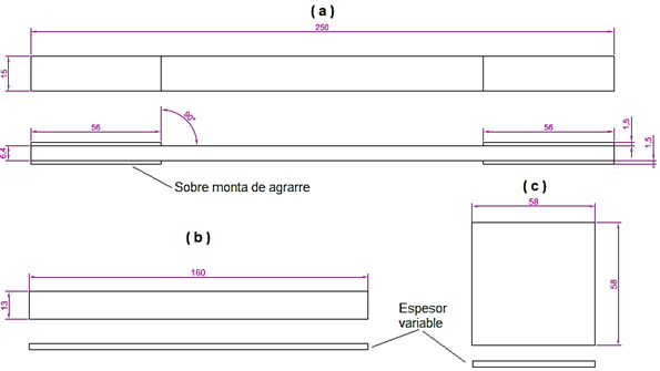 En primera instancia se manufacturaron moldes en acero para la obtención de probetas (Figura 2) en las distintas combinaciones de refuerzos del compuesto para efectuar ensayos de tracción acorde a la normas ASTM D3039-08 (ASTM D3039, 2008). Posteriormente, se realizaron pruebas complementarias de flexión e impacto para corroborar resultados bajo normas ASTM D7264M-07 (D7264 ASTM, 2007) y ASTM D5628-10 (D5628 ASTM, 2010), respectivamente. La obtención de probetas se realizó mediante la técnica de estratificación por compresión mediante un cierre mecánico de moldes por presión mecánica atornillada. La resina poliéster fue diluida con estireno monómero más la adición de octoato de cobalto y peróxido de metil etil cetona sobre la resina poliéster. Las fibras de refuerzo fueron humedecidas por inmersión en la solución, para posteriormente ser colocados sobre la superficie de los moldes previamente limpiadas y recubiertas con cera desmoldante.