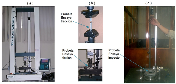 En la caracterización del material mediante probetas normalizadas se utilizó la máquina universal de ensayos marca Tinius Olsen modelo H25KS con capacidad de 25 KN en su doble columna, resolución 0.001 mm/min para velocidad y 0.001 mm en desplazamiento; facilitado por la Escuela Politécnica Nacional y una máquina para ensayos de impacto por caída de dardo con sujeción de probetas con 2 actuadores neumáticos de 50 mm de diámetro y los anillos fijo y móvil; y un dardo de 2000 g liberado desde 150 cm de altura. Para la estratificación del material se fabricaron moldes de acero AISI A-36 macho-hembra con la configuración geométrica de las probetas, y una refinación de medidas normalizadas por proceso de cizalladura.