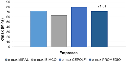 La Figura 4 presenta los resultados del análisis estadístico de los esfuerzos máximos presentados por las probetas de tres de los mayores fabricantes de partes y piezas para autobuses en Ecuador. El esfuerzo máximo promedio a tracción encontrada de las probetas (resina poliéster + 3 capas de FV) obtenida mediante estratificación manual, provoca un esfuerzo máximo promedio de 71.54 MPa y un módulo de elasticidad promedio de 4540.70 MPa.