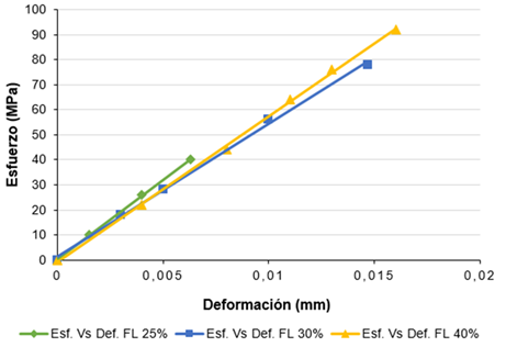En la Figura 5 se presentan las curvas de esfuerzo versus deformación a tracción del material compuesto reforzado con fibra de cabuya en sus diferentes fracciones volumétricas. En dicha figura se puede apreciar que existe un aumento en el esfuerzo máximo a tracción de 78.24 MPa para la fracción volumétrica del 30% (fibra larga), dando el mejor comportamiento mecánico respecto a la resistencia de tensión.