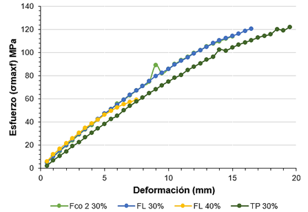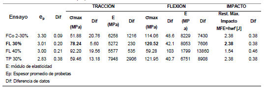 En la Figura 6, se aprecia el comportamiento del compuesto híbrido al esfuerzo máximo a la flexión en distintas fracciones volumétricas. Además de la propiedad mostrada, se determinó el módulo de flexión en la cual el compuesto combinado FL 40% y TP 30% ofrecieron menor comportamiento mecánico a la flexión. La estratificación FL 30%, a pesar de evidenciar el menor esfuerzo máximo a flexión y que no está dentro de la desviación estándar esperada con el 95% de nivel de confianza, presenta el mejor comportamiento. Basadas en estos resultados, se puede determinar que este tipo de configuración es potencialmente un material híbrido alternativo.