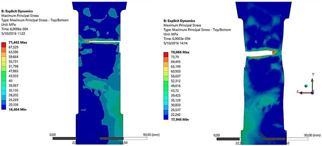 En la Figura 8, se denota la diferencia del esfuerzo máximo en las diferentes estratificaciones simuladas por el FEM; la estratificación híbrida es un 8.5% más alta que la estratificación convencional. En el caso de la evaluación del esfuerzo de Von Mises, el compuesto híbrido es superior en un 15%. Además, comparando los valores de los esfuerzos máximos obtenidos por el FEM y método experimental, se puede observar que hay una ligera diferencia del 0.2% entre ellos, respaldando los resultados hallados. Caso similar sucede con los desplazamientos máximos. La simulación entrega un resultado de 0.64 mm comparado con el ensayo real que se obtuvo de 0.7 mm.