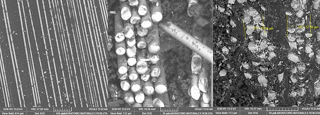 Se empleó con fines comparativos una simulación dinámica FEM de test de tracción utilizando el software ANSYS SpaceCLAIM. Finalmente, para la determinación de la adherencia y homogeneidad de la matriz respecto a los refuerzo, se utilizó la técnica de microscopía de barrido SEM de marca VEGA 3 TESCAN.