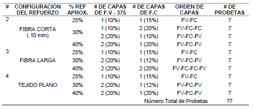 Se realizaron ensayos preliminares de tracción con las estratificaciones tradicionales (FV+FC) típicamente usados por los tres fabricantes de carrocerías en Tungurahua a velocidad de ensayo de 2 mm/min (D3039 ASTM, 2008). Luego, se ejecutó una nueva estratificación con componentes híbridos (FV+FC+FV) con el fin de comparar resultados de propiedades mecánicas. Las combinaciones para la ejecución de ensayos se presentan en la Tabla 2.