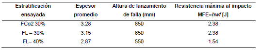 Para las configuraciones FL 30%, FCO 2 y TP 30%; se recopilaron datos del test de impacto. Para obtener las propiedades mecánicas al impacto. Mediante configuraciones caracterizadas en función del espesor promedio, altura de lanzamiento y resistencias máximas al impacto; se observa que, las distintas fracciones volumétricas presentan comportamientos similares a la resistencia al impacto, con la particularidad que FCO 2 tiene el mayor espesor de la estratificaciones y FL-40% el menor. Todo lo mencionado se puede observar en la Tabla 4.