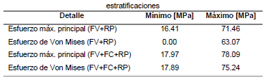 La Figura 7 y la Tabla 5, ilustran los resultados del ensayo de tracción obtenidos de las pruebas experimentales de la estratificación híbrida (FV+ FC + FV), en ellos se muestran mejores propiedades mecánicas comparadas con la estratificación normal o comercial (FV+FC). Cabe mencionar que, en la tabla mencionada se resumen las propiedades mecánicas fundamentales de los dos tipos de estratificaciones ensayadas. Vale señalar que la convergencia de la simulación bajo radio Jacobiano fue de 1.124; lo que indica que los resultados son aceptables.