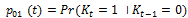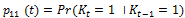 La ocurrencia de precipitación fue modelada con una cadena de Markov de primer orden. La probabilidad condicional de la ocurrencia de precipitación en cualquier día solo depende de la precipitación del día previo. La ocurrencia de precipitación es tratada como una variable binaria Kt = 1 para día con una precipitación mayor a cero (lluvioso) y Kt = 0 por día sin precipitación (seco). La cadena de Markov de primer orden es caracterizada mediante las probabilidades de transición en la Ecuación 1 y Ecuación 2: