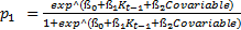 explica la probabilidad de evento de lluvia si el día anterior fue lluvioso. El modelo para la ocurrencia de precipitación es un MLG binomial (p. ej. variables 0 o 1). El valor esperado de una distribución binomial con un único ensayo (también llamado distribución de Bernoulli) es la probabilidad de éxito subyacente, es decir, en nuestro caso la probabilidad de precipitación. El MLG binomial con función logística fue usado para relacionar covariables a la ocurrencia de precipitación. Nuestra variable primaria es la ocurrencia de lluvia en el día anterior Kt-1, de modo que actualmente tenemos una cadena de Markov de primer orden. Usamos como covariables la anomalía mensual de El Niño 1+2 y El Niño 3.4; para luego extrapolarlos diariamente. Además, los valores históricos de temperatura máxima del día previo (Txt-1) y temperatura mínima del día anterior (Tnt-1). También se pueden introducir covariables adicionales, como un ciclo estacional u otros índices climáticos. La siguiente expresión matemática se utilizó para obtener las probabilidades condicionales (Ecuación 3); en este caso Covariable hace referencia a El Niño 1+2, El Niño 3.4, Txt-1 y Tnt-1. La estimación de los parámetros de la Ecuación 3 se realizó por el método de momentos.