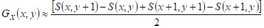 Una vez que se ha procesado el filtro Gaussiano en la imagen, el resultado de la convolución es utilizado para obtener el gradiente a través de las derivadas parciales de los ejes “x”, “y” de la siguiente forma: