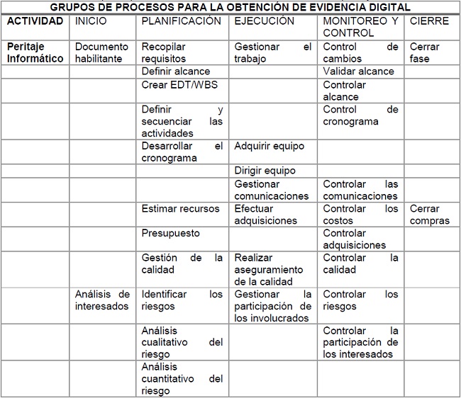 Basado en los cinco procesos de la metodología PMI (Project Management Institute, PMI), tomada del PMBOK (2013): Guía para la dirección de proyectos; se establecieron los grupos de procesos PMI para gestionar evidencia digital al existir un incidente de seguridad informático, los mismos que se muestran en la Tabla 1, en la cual se puede observar los distintos procesos y actividades relacionados con el peritaje informático.