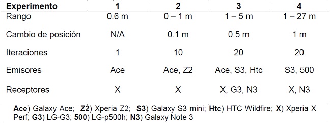 Para determinar cómo los dispositivos Bluetooth interactúan entre ellos y la relación que existe entre el RSSI y la distancia, se realizó el primer prototipo de aplicación para la toma de datos; la aplicación se instaló en los dispositivos receptores. Se plantearon cuatro experimentos que midieron RSSI sobre distancias controladas y con línea de vista directa entre emisor y receptor; en la Tabla 1 se puede apreciar un resumen de estas experimentaciones cuya principal característica fue el cambio controlado de distancias con iteraciones de varias mediciones RSSI en cada punto. Los datos recopilados se analizaron en Weka (Witten, Frank, Hall, & Pal, 2016) aplicando regresión lineal con validación cruzada de diez iteraciones.