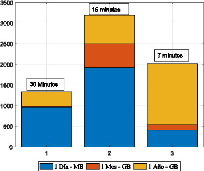 En la Figura 2 se muestra un análisis de datos con lecturas cada 7 minutos, se obtiene un total de 206 lecturas diarias. Si se toman como referencia lecturas cada 15 minutos, se tiene un total de 96 lecturas diarias. Finalmente, con lecturas cada 30 minutos, se tiene 48 lecturas diarias. Si advertimos un número de 4 millones de clientes, caso ecuatoriano, provocaría el verdadero efecto de Big Data; el almacenamiento; entonces, el tratamiento de la información tiene mucha validez para las empresas eléctricas especialmente en la toma de decisiones, patrón de consumo eléctrico y la respuesta de la demanda, para esto se debe recordar que una generadora no cuenta con almacenamiento de energía y su generación se da a partir de la demanda por lo cual conocer el patrón de comportamiento de los usuarios reduce costos por generación eléctrica. Los valores en color azul se encuentran en MB; mientras que en color anaranjado y rojo en GB.