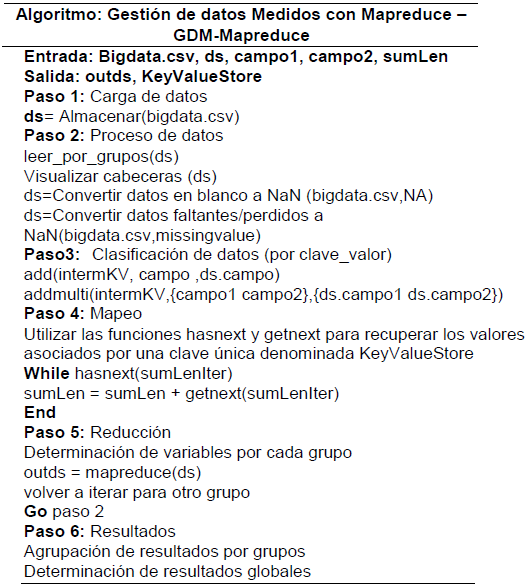 Una vez formado el paquete (mapeado) se procede con la etapa reduce que se encarga de realizar las operaciones y a su vez guardar los resultados parciales para posteriores cálculos. Este proceso se vuelve a iterar hasta que se termine con todos los datos almacenados en el ds. El pseudocódigo del algoritmo GDM-Mapreduce se presenta en la Figura 3. Es importante tener en cuenta que las restricciones o criterios de selección que formarán un subconjunto de registros que se requieren analizar, incurrirán en un mayor tiempo de gestión de mapreduce, es decir a más restricciones de búsqueda el algoritmo empleará mayor tiempo de procesamiento y por tanto, mayor consumo de energía empleado en el proceso.