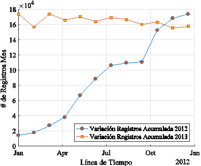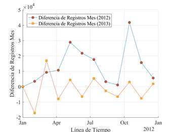 En la Figura 6 se presenta la variación de registros que fueron efectuados a los medidores inteligentes para el usuario tipo 1 en cada mes. Se puede apreciar que no tiene un comportamiento singular o uniforme en el número de muestras recolectadas, entonces se tiene meses en donde el número de registros fue mayor que otros meses en el mismo año.