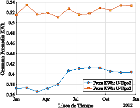 En la Figura 4 se visualiza el comportamiento del consumo promedio en KWh respecto de la variación en la línea del tiempo, obtenidos a partir de la técnica de mapreduce que permite a partir de datos históricos conocer la variación del consumo de energía; esto se puede aplicar a los tipos de clientes de cada empresa de distribución eléctrica y generar un análisis de demanda de energía en función de los datos históricos, de esta manera se consigue una línea de tendencia determinística para la respuesta de la demanda de energía eléctrica, que permitiría reducir los índices de generación eléctrica, al trabajar únicamente sobre la demanda debido a que el costo por energía no consumida es significativo para una empresa generadora.