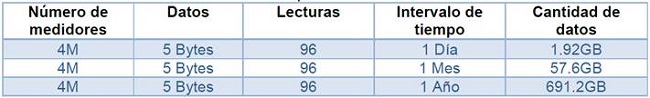 Para contemplar la necesidad de realizar un proceso en paralelo es importante justificar que el crecimiento de la información en un MDMS realmente cumple con las características de big data; por lo tanto, si se consideran medidores inteligentes de energía eléctrica con intervalos de lectura cada 15 minutos, en 24 horas se tendría 96 lecturas por día y en un mes 2880 lecturas. Además, si se considera que cada lectura representa 5 bytes; en un escenario de 4’000.000 de abonados, al multiplicar por 5 bytes genera una cantidad aproximada a 20’000.000 bytes por lectura. La Tabla 1 muestra el crecimiento de la información para un intervalo entre cada lectura.