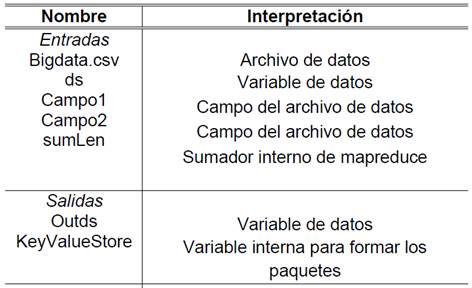 El algoritmo GDM-Mapreduce toma como entrada un archivo de extensión csv que tiene aproximadamente 11Gb de tamaño y lo almacena en la variable denominada ds. Esta variable contiene el criterio incorporado de búsqueda; a partir de ese momento todas las referencias de programación se orientan hacia la variable ds. Posteriormente, se debe preparar estos datos para ser mapeados; es decir, se debe dejar lista la data (sin espacios en blanco dentro de los campos) para que forme paquetes de datos más pequeños y pueda trabajar de forma oportuna. Se hace uso de las funciones propias de MapReduce para crear los paquetes mediante el método de clave-valor. La Tabla 2 muestra las variables presentadas por el algoritmo.
