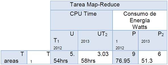 En la Tabla 3 se presentan el tiempo de procesamiento y el consumo de energía de la etapa mapreduce para una big data de 11GB, obtenidas a partir de un caso de estudio aplicado a la big data de uso libre obtenido del sitio Web London Data Store. Ver (Networks, 2017). En la tabla se observa el tiempo requerido por la técnica mapreduce para explorar y extraer la información de tres tipos de usuarios de energía eléctrica referidos por tipo1 UT1- 2012, tipo2 (UT2) - 2013; adicionalmente, se presenta el consumo de energía en cada proceso P1-2012, P2 - 2013 en watts. El número de registro evaluados fueron 1’074.204 distribuidos de forma no uniforme entre doce meses. En el transcurso se ha identificado que la big data analizada tenía un registro cada 30 segundos, muchos de esos registros tuvieron un valor 0, debido a las fallas del sistema de comunicaciones empleado o por un desperfecto del medidor inteligente. El ordenador utilizado para ejecución del algoritmo tiene un procesador I7, 3.4GHz-Procesador, 8MB-RAM, 19.5V, 3.34-Amp y desarrollado bajo entorno Matlab R2016b.