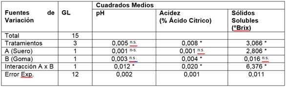 El Análisis de Varianza (Tabla 4) muestra que la adición de suero ácido no influyó significativamente en la acidez de los tratamientos; mientras que la goma xanthan y la interacción de los factores si afectaron.