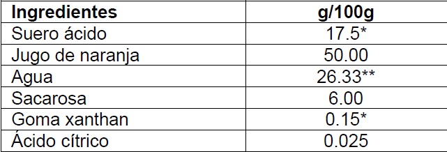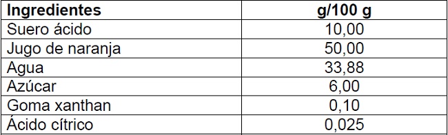 El contenido mínimo de sólidos solubles (4,5 °Brix) del néctar corresponde al mínimo de aporte de jugo (50%) (INEN, 2008). El jugo de naranja se obtuvo mediante un exprimidor eléctrico “Oster” para cítricos, y se midió sólidos solubles por el método refractométrico 983.17 de la Association of Official Agricultural Chemists (AOAC, 2012). Para la obtención del suero ácido, la leche fue pasteurizada a 72°C por 15 segundos garantizándose la eliminación de la enzima fosfatasa (Luquet, 1993). Se añadió ácido cítrico hasta alcanzar un pH de 5,4 para la precipitación de las proteínas (Arciniega, 2010). Se adicionó 5 gotas de cuajo líquido, marca CHY-MAX® de CHR HANSEN por cada litro de leche y se calentó a 42°C. Se dejó reposar hasta la formación de la cuajada. Finalmente, el suero fue filtrado hasta eliminar los residuos para medir sólidos solubles mediante el método refractométrico 983.17 (AOAC, 2012). La cantidad de azúcar fue calculada con base en un balance de masa considerando los valores de sólidos solubles del jugo de naranja y suero ácido. La cantidad de goma xanthan usada para bebidas es de 0,1 y 0,5% (Gaviria, Restrepo y Suárez, 2009). El ácido cítrico se añadió hasta ajustar el pH a 3,5. El agua se determinó por diferencia para completar 100 g de producto (Tabla 1).