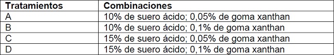Los tratamientos fueron dispuestos en un diseño completamente al azar (DCA), con arreglo factorial 22 (suero ácido: 10% y 15%; goma xanthan: 0,05% y 0,1%) y 4 repeticiones. Los datos fueron analizados mediante el Análisis de Varianza (ANOVA) y prueba de Tukey con 5% de probabilidad. Los factores y sus niveles fueron determinados por pruebas preliminares con base en estudios realizados por Jiménez (2014).