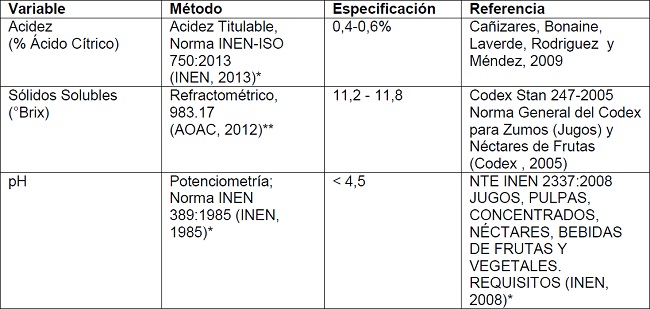 Se realizó una ponderación otorgando valores de 3, 2 y 1, a las variables de respuesta. Los sólidos solubles (°Brix)(3) son los más importantes porque influyen en las propiedades reológicas y la estabilización de los jugos y están relacionados con las cualidades organolépticas de olor y sabor, además pueden afectar la apariencia del producto por la sedimentación (Mothé y Correia, 2003). La norma NTE INEN 2337:2008 (JUGOS, PULPAS, CONCENTRADOS, NÉCTARES, BEBIDAS DE FRUTAS Y VEGETALES. REQUISITOS) indica que la acidez (2) es proporcionada por la fruta (INEN, 2008), y el pH (1) era una variable que se debía ajustar con lo especificado.