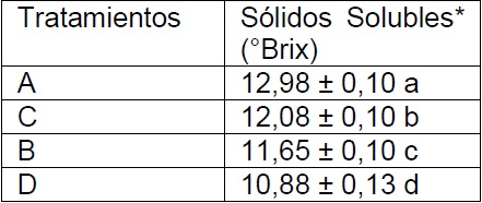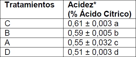 Se observaron diferencias significativas en % de acidez y contenido de sólidos solubles, pero no en el pH de los tratamientos (Tabla 4).