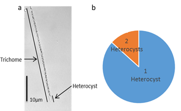 The thricomes collected were 30µm up to 70µm long, no circular morpho types were found. Only a 23 per cent of the samples observed contained two heterocysts per thricome being the majority the single heterocyst thricome (Figure 2.a). These structures are specialized nitrogen-fixing cells formed during nitrogen starvation (Berman-Frank et al., 2003).