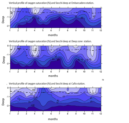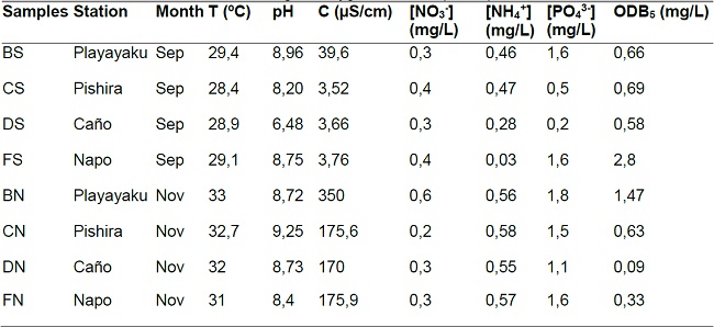 Dissolved phosphorus ranged from 0,2 mg/L at the deep zone to 1.6 µg/L at mouth of Playayacu River, congruent with the values for a eutrophic lake.