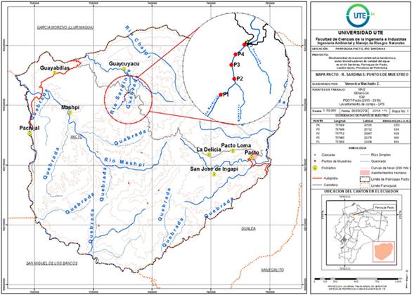 El río Sardinas se ubica en Ecuador, en la provincia de Pichincha, cantón Quito, parroquia de Pacto. Nace en la loma Esperanza, de vertientes naturales, su extensión aproximada es de 40 km, desemboca en el río Guaycuyacu que posteriormente se conecta y desemboca en el río Guayllabamba (Villalva, 2018). Presenta un bioclima tropical megatérmico muy húmedo, se identifican dos épocas climáticas: 1) época lluviosa, presente de diciembre a mayo, y 2) época seca, presente de junio a noviembre (Ministerio de Agricultura y Ganadería - Instituto Espacial Ecuatoriano [MAGAP - IEE], 2013). La pluviosidad varía entre los 2000 mm y 4000 mm de precipitación anual y la temperatura oscila entre 12 y 20 °C (Herrera, 2018). Los puntos de muestreo se encuentran en la formación vegetal bosque siempreverde piemontano de Cordillera Occidental de Los Andes BsBn04 (MAE, 2013).