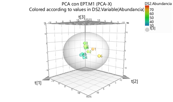 Mediante el Análisis de Componentes Principales (PCA) se pudo observar que el punto de mayor abundancia es el punto 1 que corresponde al punto con mayor oxígeno disuelto y menor conductividad, lo cual concuerda con lo publicado por Moya et. al. (2009).