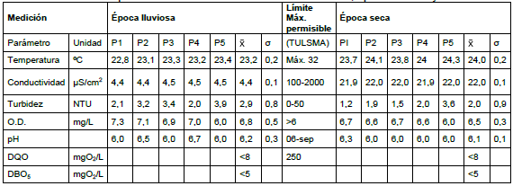 El límite máximo permisible para temperatura del agua es de 32°C. El río cumple con estas especificaciones tanto en la época lluviosa (23.4°C) como en la seca (24.0°C); el aumento de temperatura se encuentra ligada a la influencia de las condiciones climáticas del área.