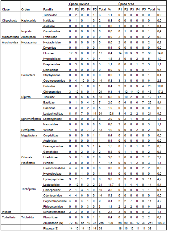 Se recolectaron un total de 526 individuos, 265 en época lluviosa y 261 en época seca que corresponden a 5 Clases, 13 órdenes y 38 familias, 31 en la estación lluviosa y 30 en la estación seca. En época lluviosa el taxón más abundante fue Leptophlebiidae con un total de 34 individuos que corresponde al 12,8% de los especímenes colectados. En la estación seca el taxón más abundante fue Chironomidae con 45 individuos que corresponde al 17,2% de los individuos colectados (Tabla 3).