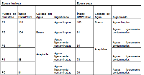 En la época lluviosa los puntos P1 y P2 obtuvieron valores altos del Índice BMWP/Col (Roldán, 2003), es decir que su calidad de agua es buena (aguas limpias), gracias a la presencia y abundancia de taxones de los órdenes Ephemeroptera y Trichoptera. Mientras que, los puntos P3, P4 y P5, obtuvieron valores moderados, es decir, que tienen una calidad de agua aceptable (ligeramente contaminada). Se evidencia la disminución de familias, en especial de los órdenes Ephemeroptera y Trichoptera, así como se acentúa la presencia de macroinvertebrados más tolerantes a la contaminación, como aquellos de los órdenes Coleoptera y Diptera. En la estación seca el P1 tuvo calidad buena y los puntos P2 - P5, se encuentran en un rango de calidad de agua aceptable (Tabla 4).