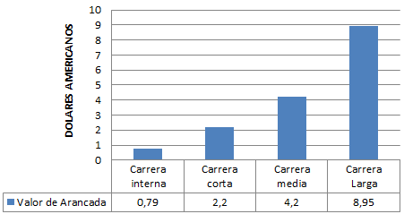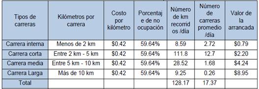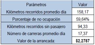 El costo de la arrancada, según se especifica en la Tabla 8, considera el valor de los kilómetros recorridos sin pasajero, los mismos que deberán ser cubiertos por las carreras promedio realizadas al día.