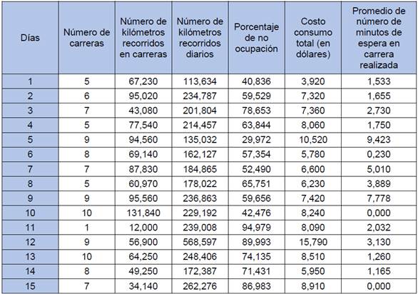 La primera variable oferta de kilómetros se basa en obtener los datos de la distancia diaria que recorre el vehículo (Kdía), y la ocupación del mismo; es decir, el porcentaje de la distancia en la cual el taxi se encuentra sin pasajero (%NO). Para el caso del cantón Chordeleg los resultados se pueden apreciar en la Tabla 2.
